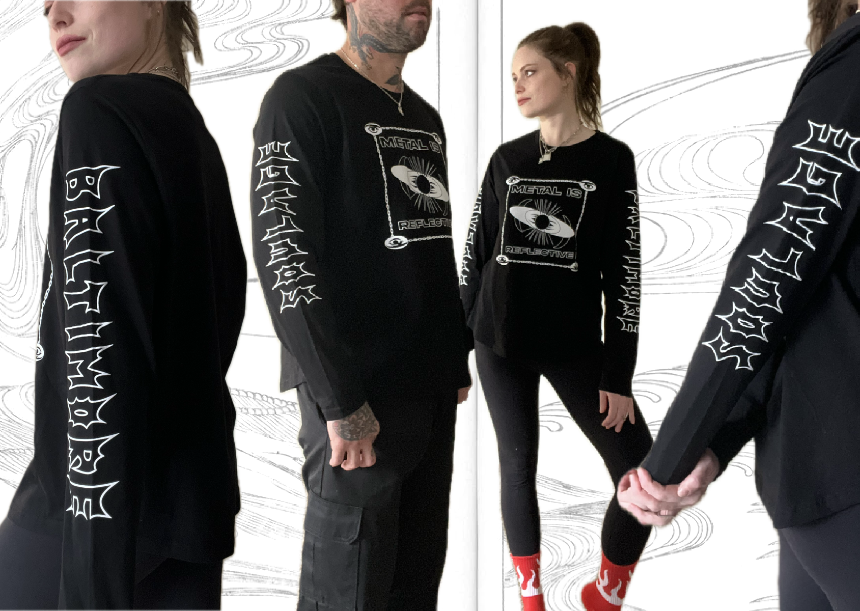 METAL IS REFLECTIVE long-sleeve tees are available in sizes S, L only.